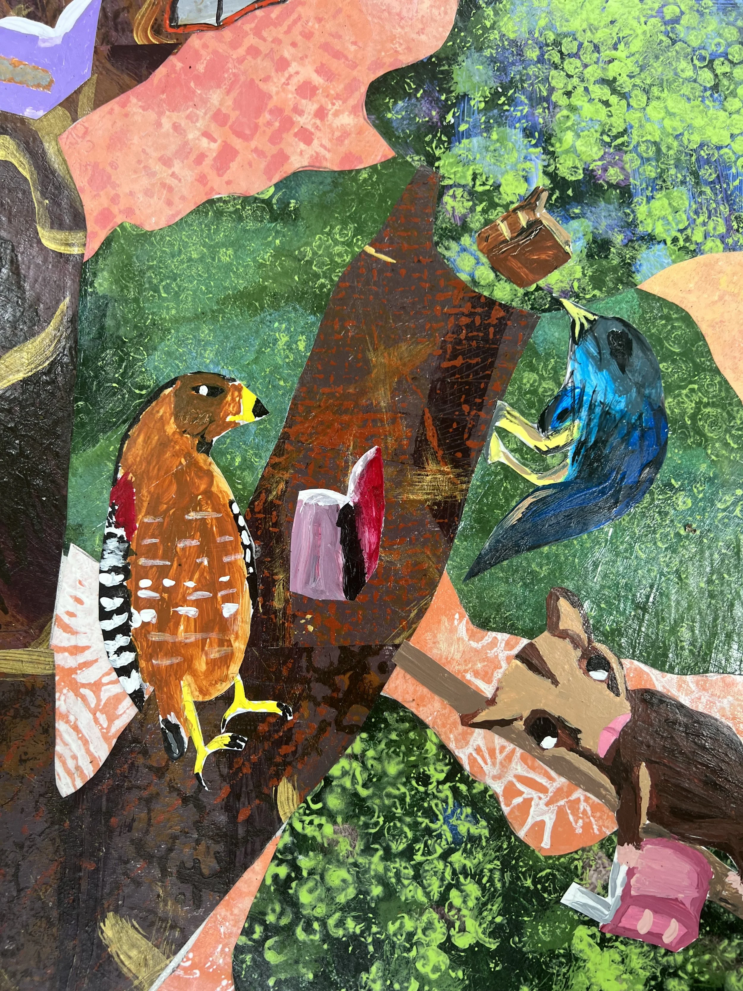 In March working with the 4th graders at Holly Springs Elementary! Some of the kids helped paint textured backgrounds that we used to create the ground, sky, tree and leaves. Other kids drew their own animals reading books and painted them. We are very pleased with the result, which will hang in the reading courtyard!