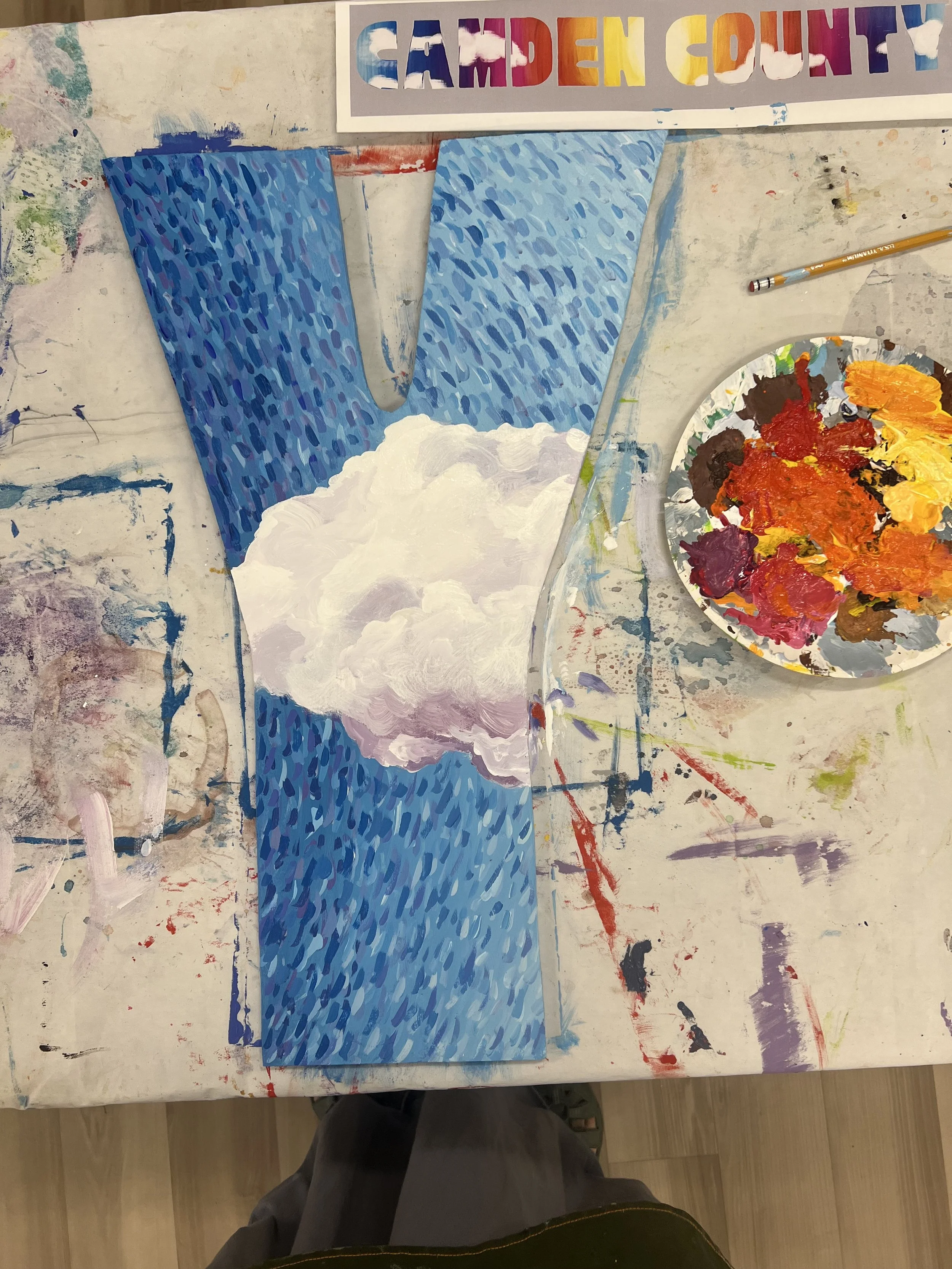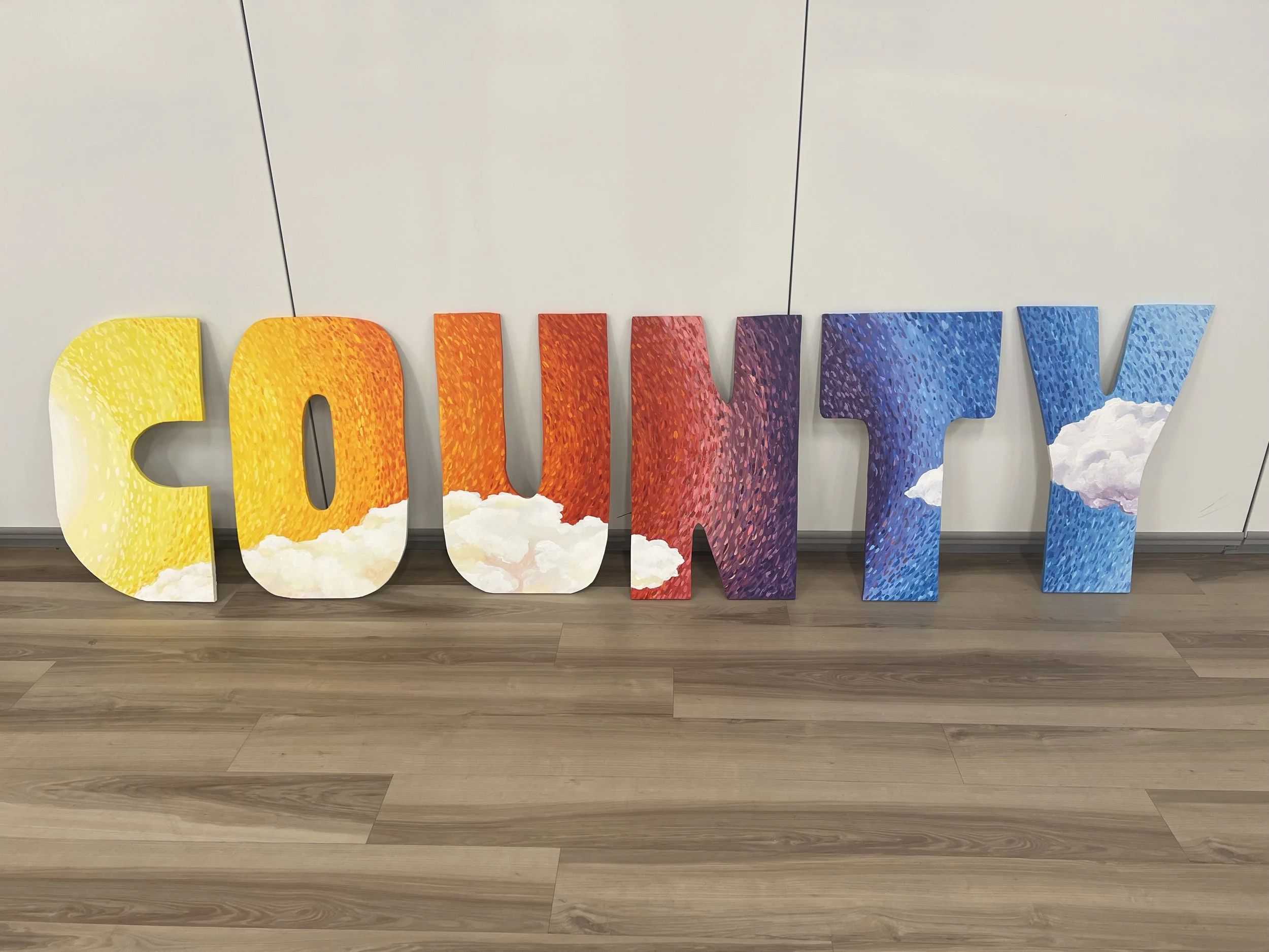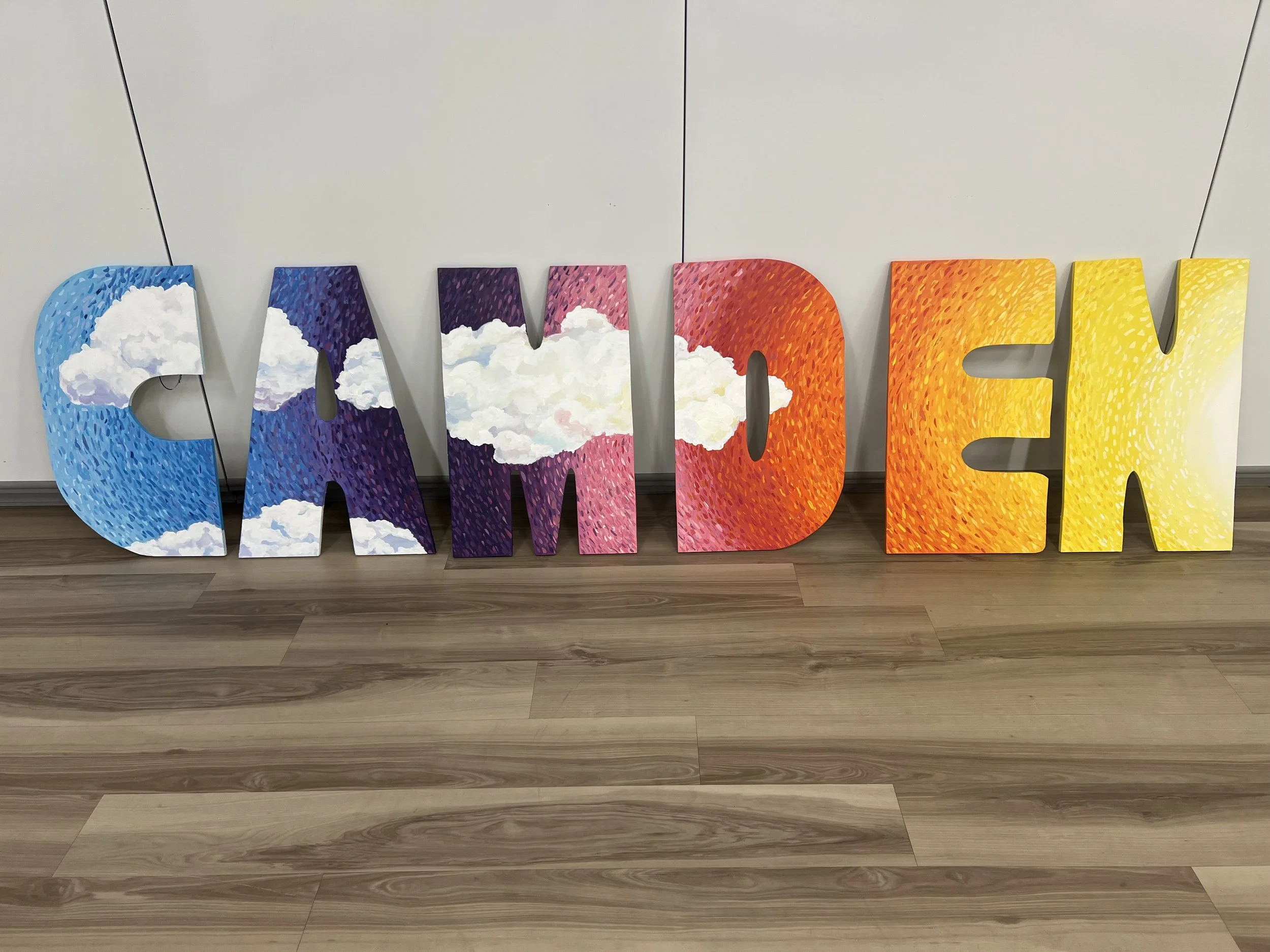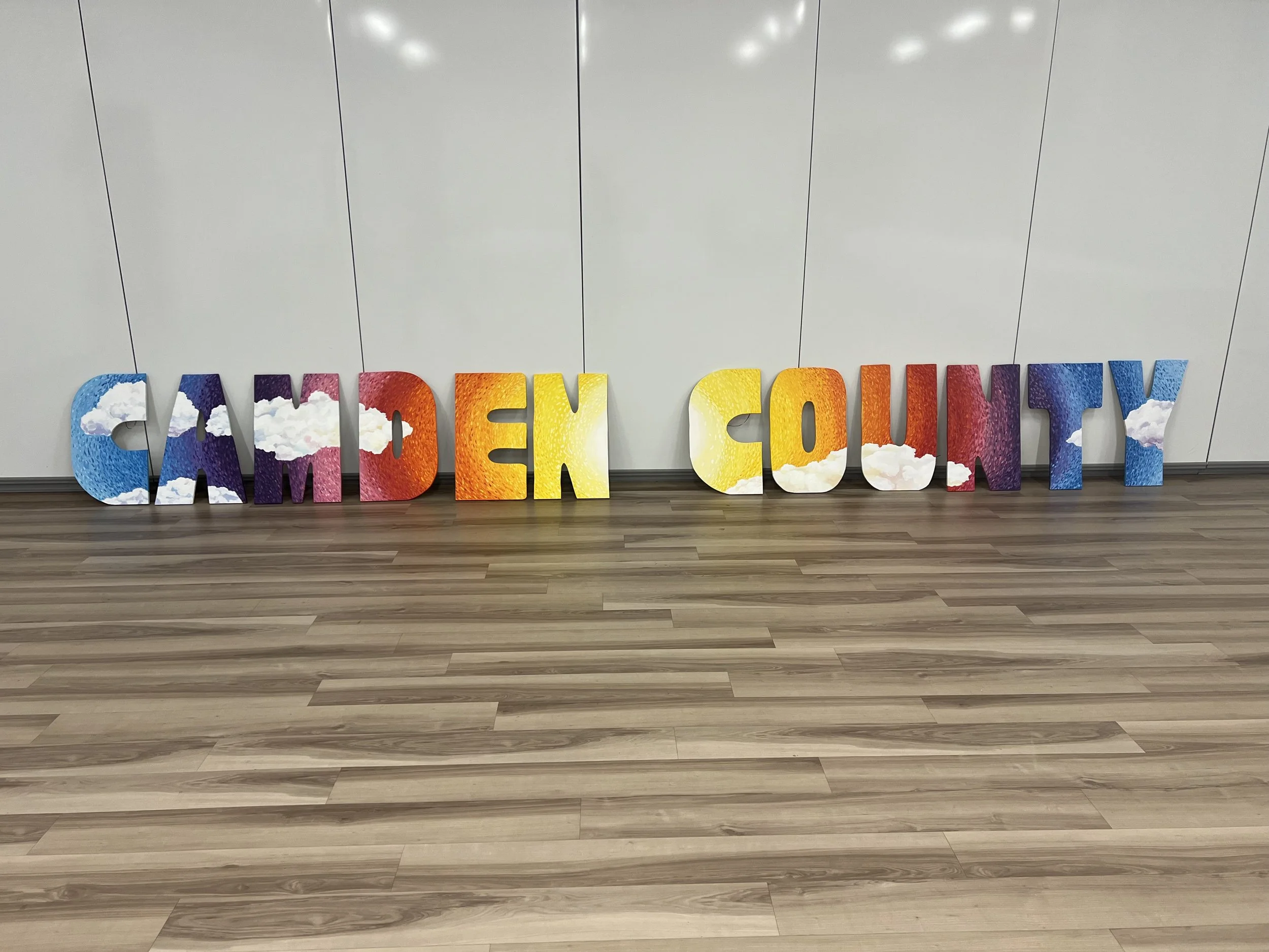 We are so proud to have done another cool community art project with Camden County Library! This time we made a text mural that will hang above the shelves in the library. We designed and cut the letters from wood. The community was invited in to paint a sunny color spectrum across the letters. The result is sure to draw attention! We are so honored to help make Camden County library the destination and resource that it is for this community. And of course we love spending time in beautiful Elizabeth City.